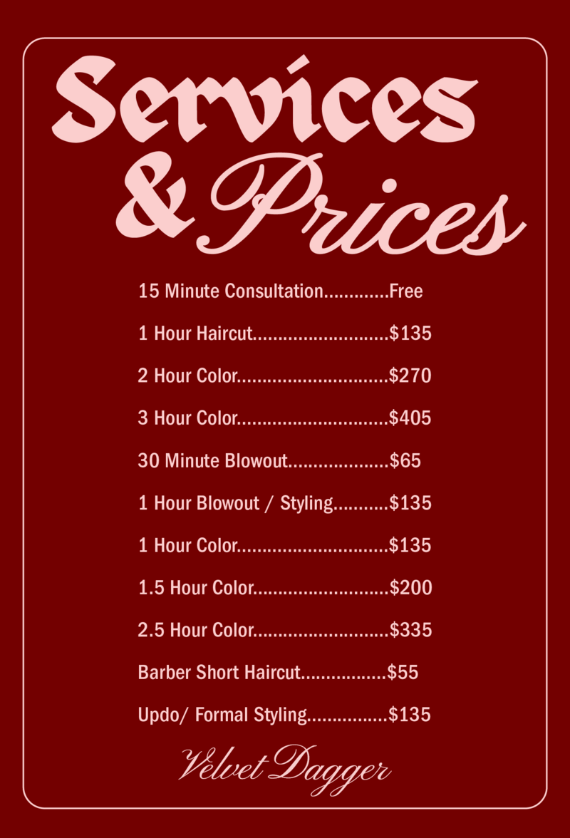 Velvet Dagger cuts through the ordinary. Our salon is all beauty with bite. From blowouts to bold color, we’re here to sharpen your look and turn heads.